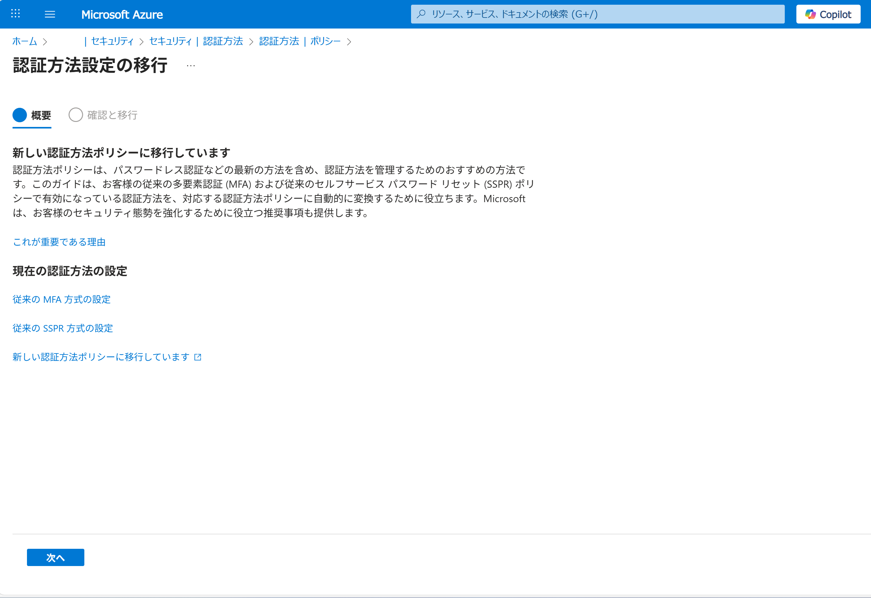 ウィザードの最初のページでは、認証方法ポリシーの移行の説明、およびレガシー ポリシーや公開情報へのリンクが表示されます。