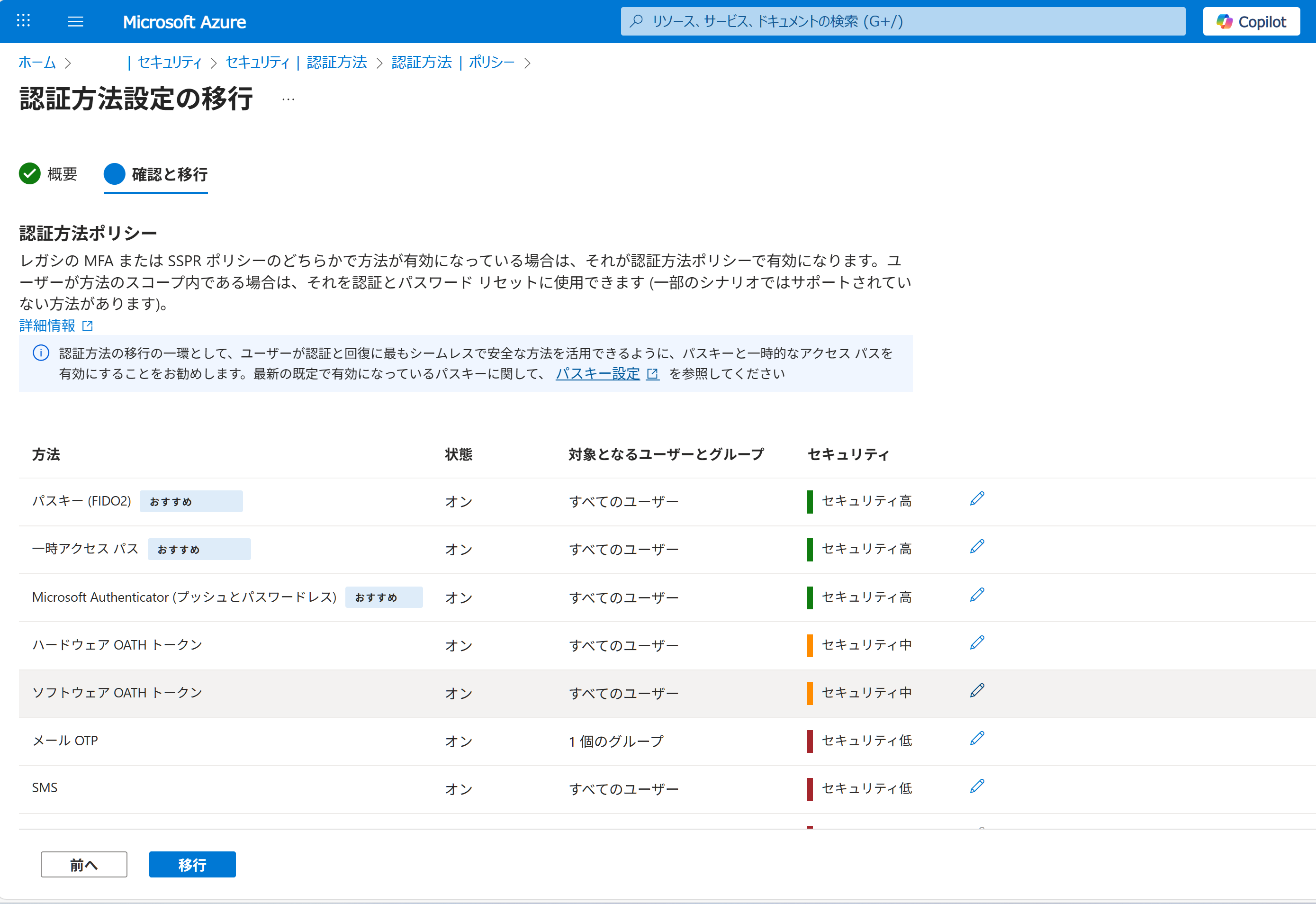 [次へ] をクリックすると、現在、テナントのレガシー MFA ポリシーとレガシー SSPR ポリシーで有効にしている方法に基づいて、認証方法ポリシーの構成案が表示されます。いずれかのレガシー ポリシーで認証方法が有効になっている場合、認証方法ポリシーでも有効にすることをお勧めします。この構成のまま移行を完了されますと、ユーザーはこれまでに使用していたものと同じ認証方法を使用して、MFA および SSPR が実行可能な動作が想定されます。注意点といたしまして、これまでレガシー ポリシーで管理できなかった、パスキー(FIDO2)、一時アクセス パス、Microsoft Authenticator などの Microsoft が推奨する最新の認証方法は既定ではオンの状態で表示されています。
