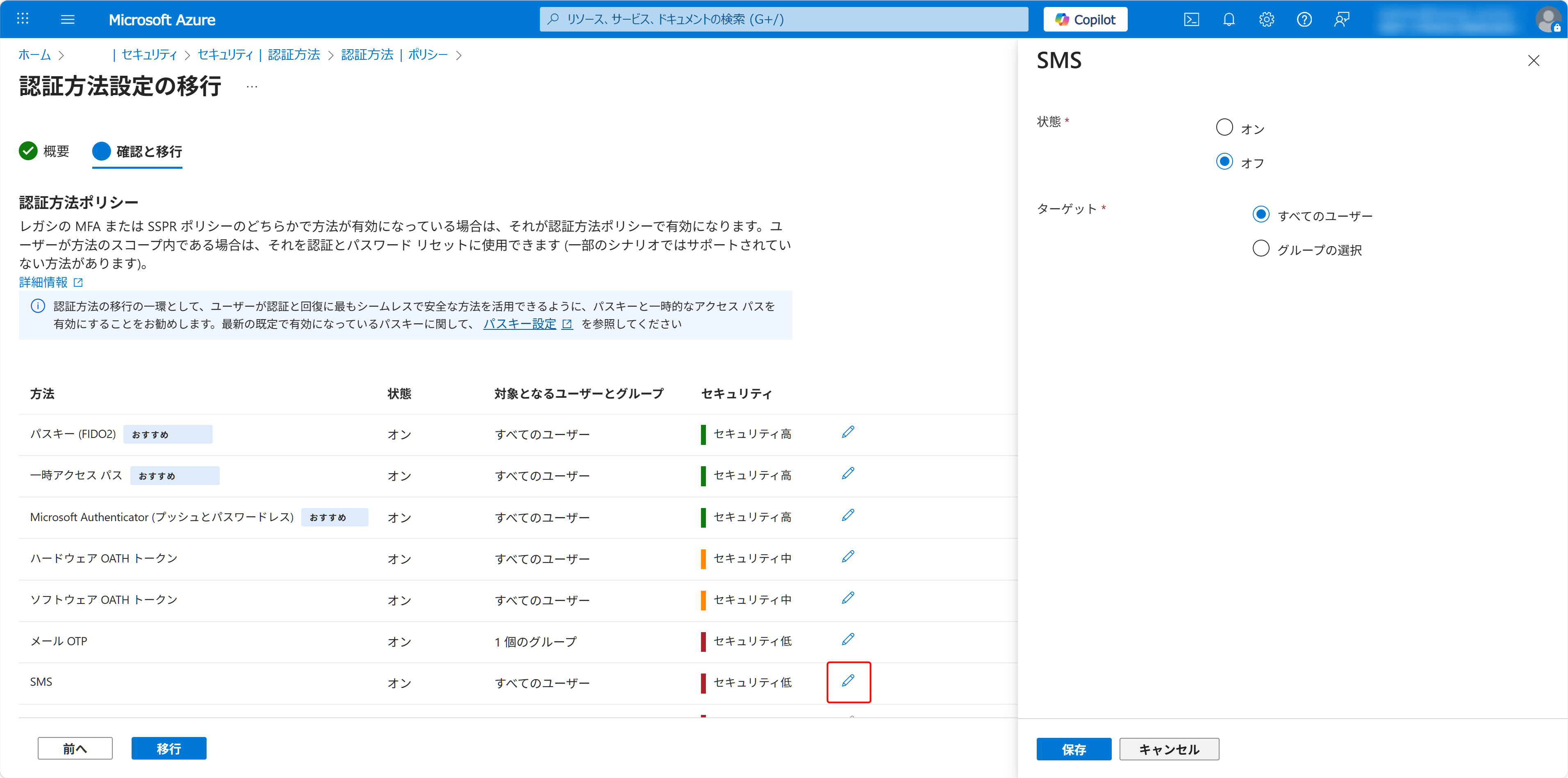 認証方法ポリシー | SMS による認証方法を無効に設定 |