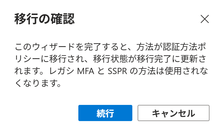 表示されている構成に問題が無ければ、[移行] を選択して移行を実施します。以下の画面が表示されたら、[続行] を選択します。認証方法ポリシーは、ウィザードで指定された構成と一致するように自動で更新され、レガシー MFA ポリシー、レガシー SSPR ポリシーはグレーアウトされ、適用されなくなる動作になります。