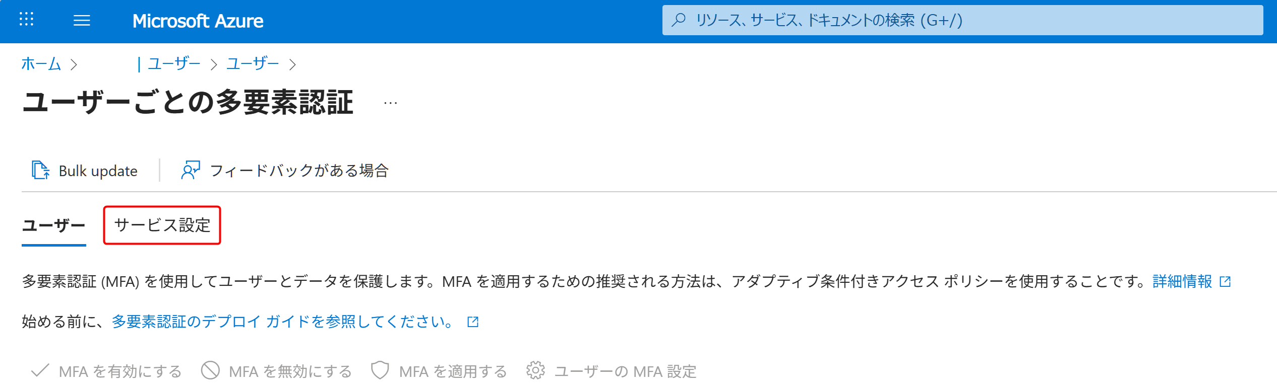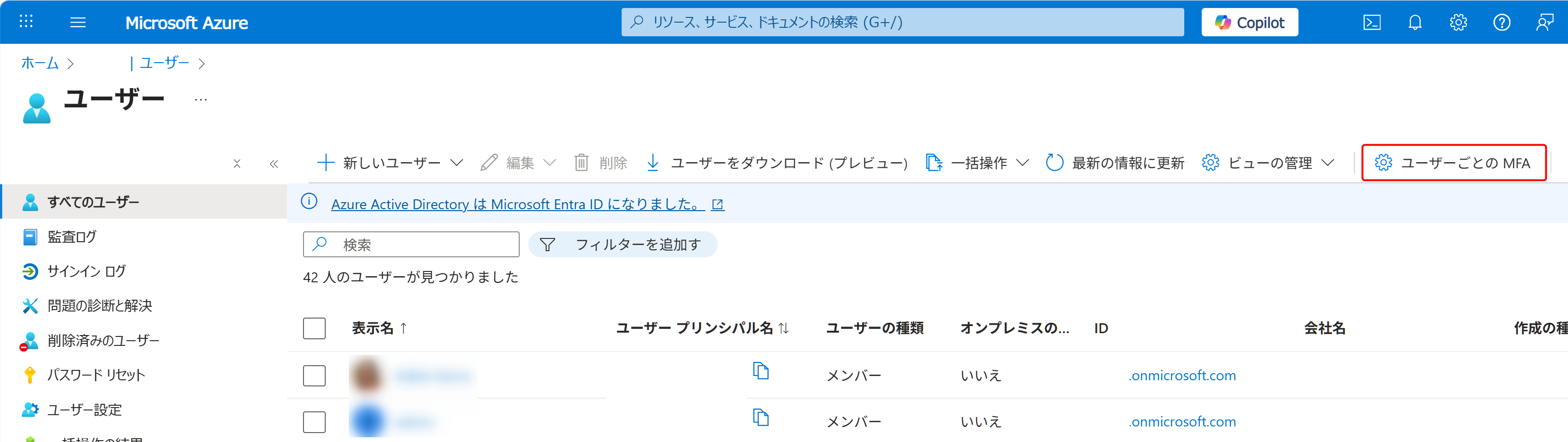 Azure Portal (https://portal.azure.com) > [Microsoft Entra ID] > [ユーザー] > [ユーザーごとの MFA] に移動します。