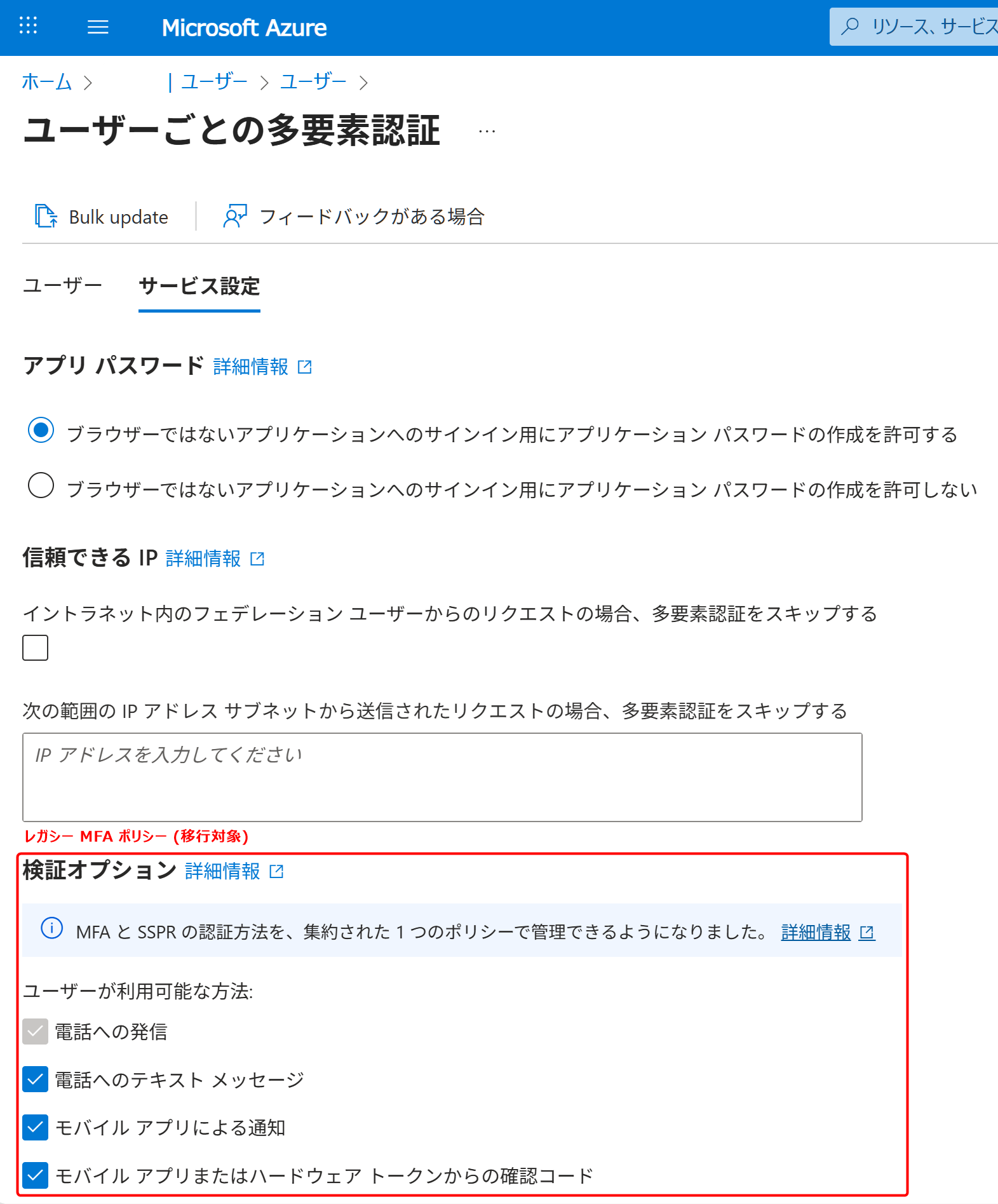 [検証オプション] 項目からどの項目にチェックが入っているかを控えます。これがレガシー MFA ポリシーの設定です。