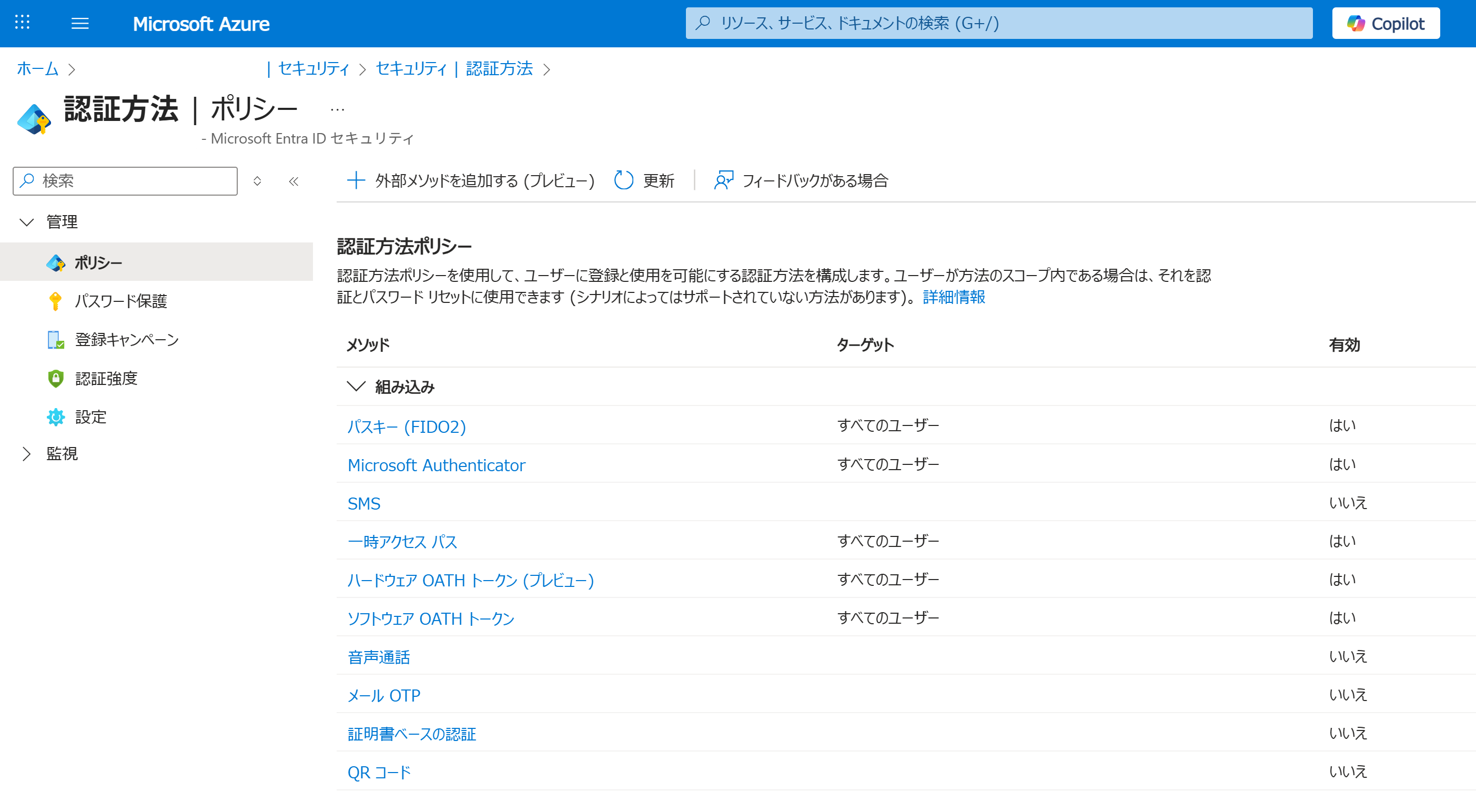 [Microsoft Entra ID] > [セキュリティ] > [認証方法] > [ポリシー] に移動します。