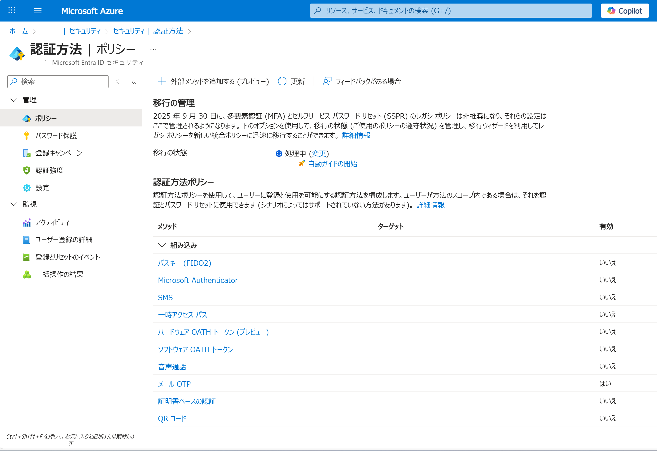 新しい認証方法ポリシーについては、Azure Portal (https://portal.azure.com) > [Microsoft Entra ID] > [セキュリティ] > [認証方法] > [ポリシー] から確認します。