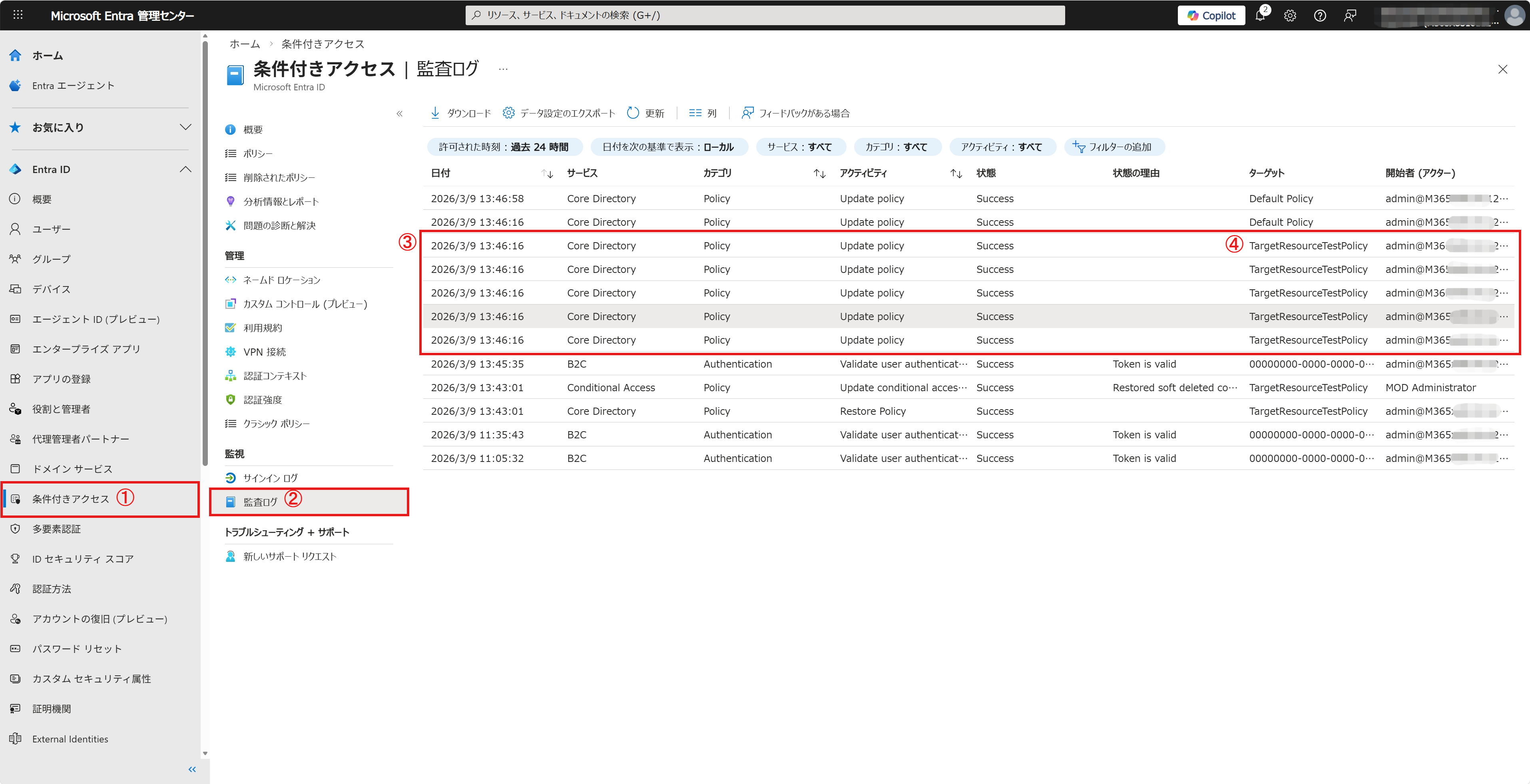この事象が発生すると、Microsoft Entra 管理センター上で個々の監査ログを確認しても、実際にポリシーのどの設定がどのように変更されたのかを判別しにくい状態になります。